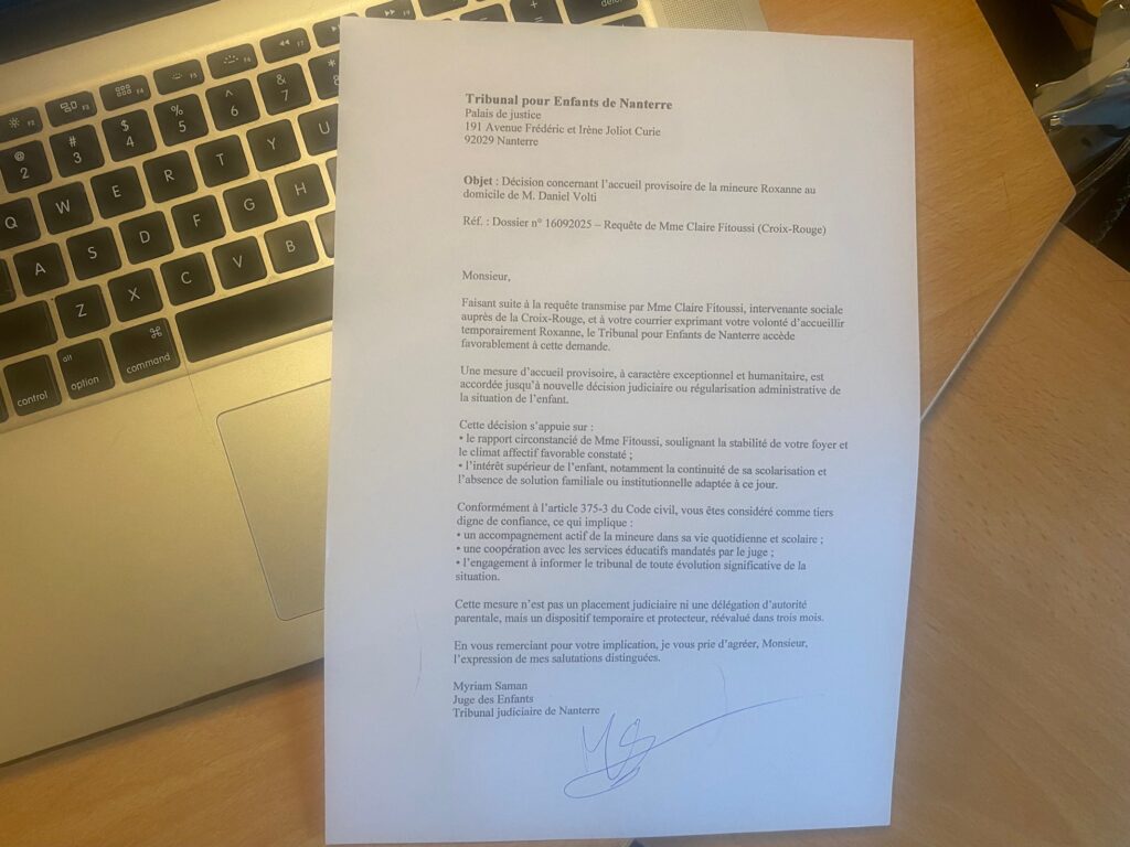 Faisant suite à la requête transmise par Mme Claire Fitoussi, intervenante sociale auprès de la Croix-Rouge, et à votre courrier exprimant votre volonté d’accueillir temporairement Roxanne, le Tribunal pour Enfants de Nanterre accède favorablement à cette demande.