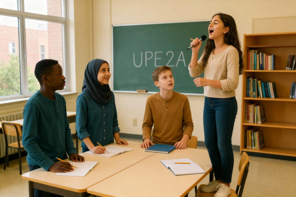 Roxanne retrouve ses amis au collège, en classe de UPEAA. À la fin des deux heures de cours obligatoires, la professeur anticipe la demande de ses élèves, en leur proposant de rester encore un peu, s’ils voulaient, pour avancer sur leur projet musical. Assise à son bureau, elle sort un paquet de copies à corriger, mais observe discrètement le travail de ses artistes.